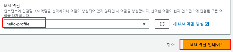 아래처럼 iam role 을 할당하고 "I AM 역할 업데이트"를 누른다.