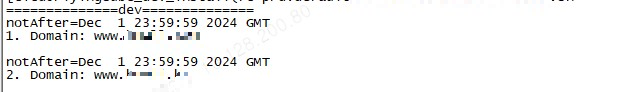| echo "==============prd==============" dnslist=( "www.naver.com" "www.moon.com" ) index=1 for dns in "${dnslist[@]}"; do echo | openssl s_client -connect $dns:443 -servername $dns 2>/dev/null | openssl x509 -noout -enddate | grep 'notAfter' echo "$index. Domain: $dns" echo "" ((index++)) done |